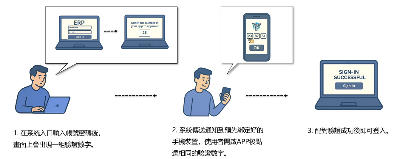 採用 MFA/FIDO 降低密碼外洩風險,支援OIDC與SAML2協定,能夠整合各種系統,無需調整原有網路架構快速導入安全驗證機制。亦提供手機APP認證方式,於登入時在事先綁定好的手機上點選配對數字即可快速確認身份。