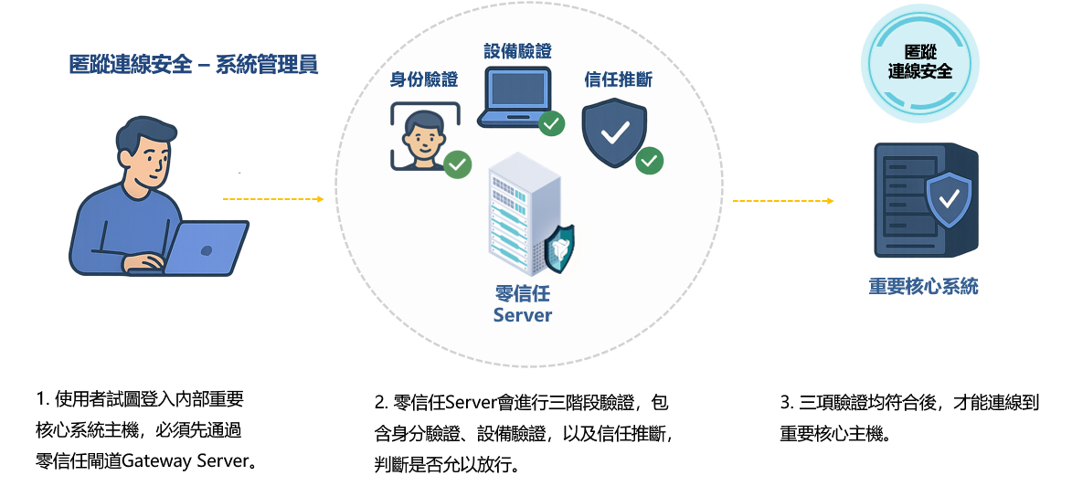 1. 使用者試圖登入內部重要核心系統主機,必須先通過零信任閘道Gateway Server。