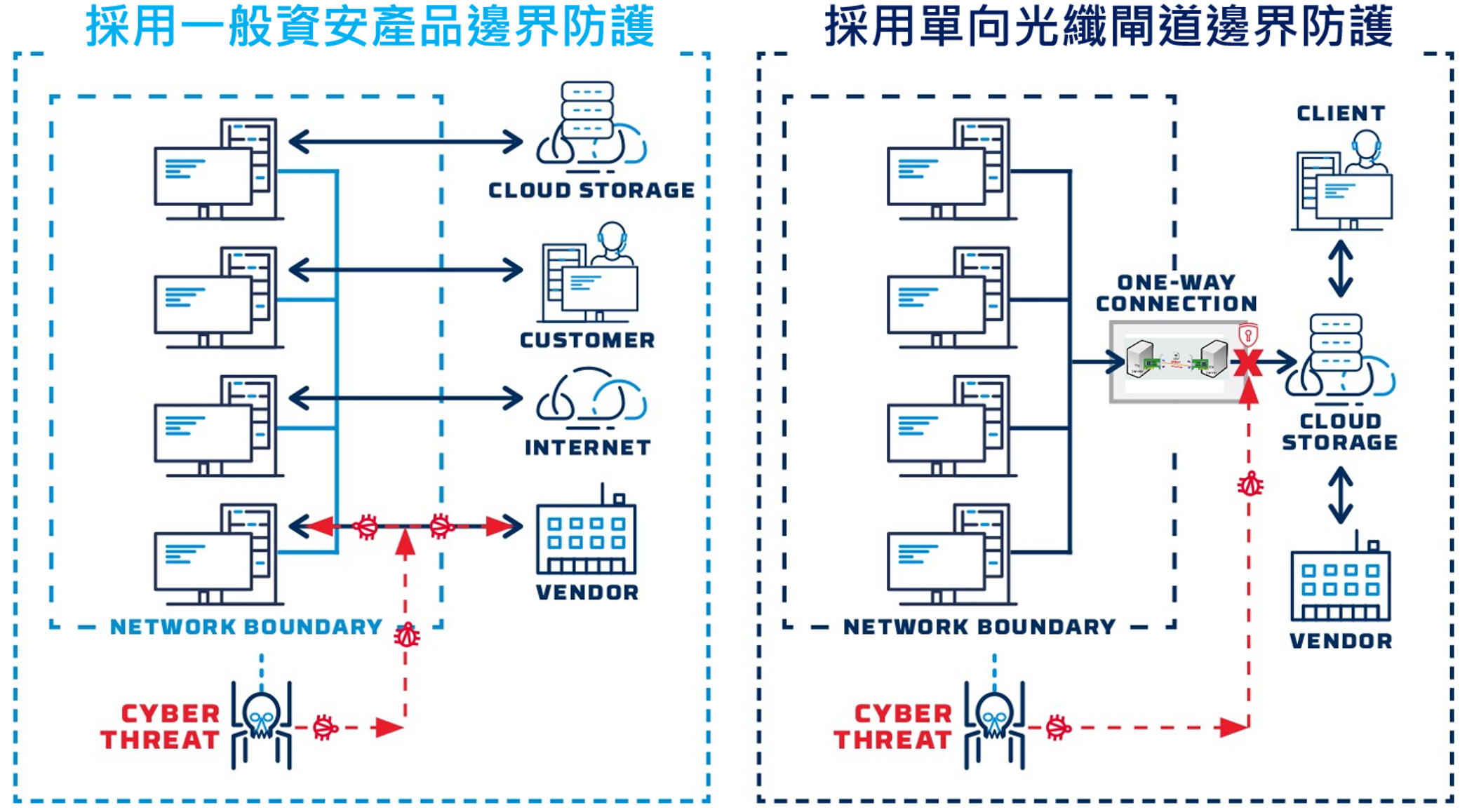 NGB 單向傳輸閘道器以物理單向光纖技術打造零風險資料隔離環境,防止外部入侵與資料竊取。